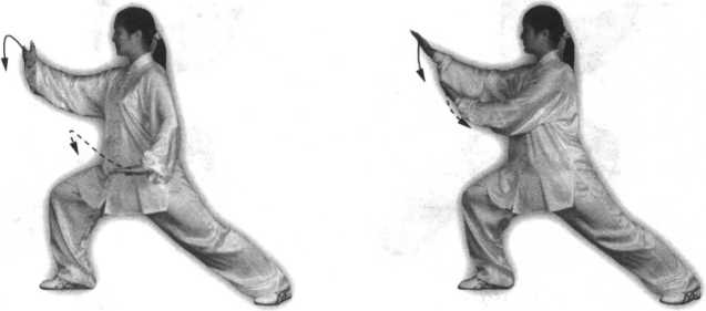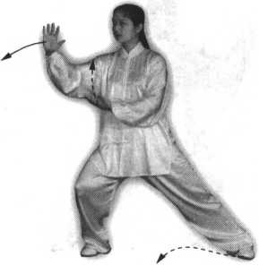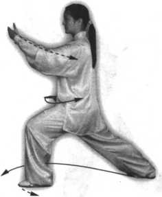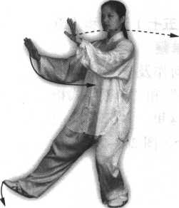 ①身体重心稍向右移,右脚尖微向外撇,随之身体重心又移至右腿;左 手心翻转向上,右手心翻转向下,两手相对在体前成抱球状;同时左脚跟进 至右脚内侧,脚尖点地(如果能稳妥地变换身体重心,左脚前进时也可不点