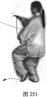 ②身体重心略向后移,左脚尖外撇,身体左转;右脚收至左脚内侧,脚尖 点地(熟练后,可以不点地);同时,左臂平屈胸前,右手经体前向左上画弧, 与左手上下相对成抱球状;眼看左手(图253 )。