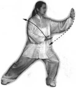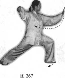 ③身体重心稍向后移,右脚尖微外撇,随之身体重心又移至右腿,左脚跟 进至右脚内侧,脚尖点地;左手画弧收至腹前,手心向上,右手经胸前落下, 手心向下,两手相对成抱球状;然后左脚向左前方迈出一步,成左弓步;左手 上举置于左额前,手心斜向上,右手则向前推出;眼看右手(图246、247 )o