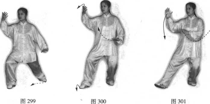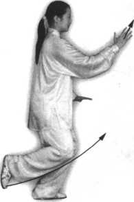 ①左脚尖微外撇,右腿渐渐蹬直,上体向前直起,右脚尖里扣,左腿继续