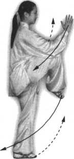 前弓,身体重心逐渐前移至左腿,然后右 腿提起成左独立式;同时右勾手变掌,沿 身体右侧向前、向上举起,停于右腿上 方,高与鼻平,一肘与膝相对,手心向左, 左手则下落停于左胯旁,手心向下;眼看 右手(图285、286 )o