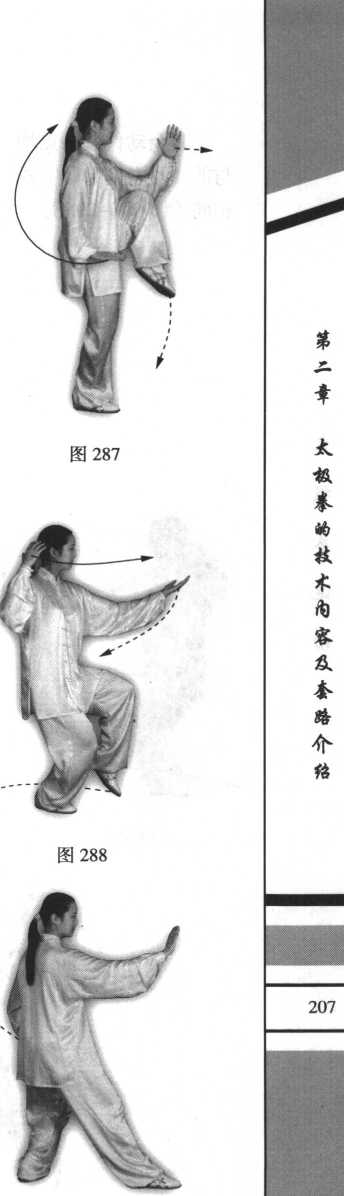 ②右脚下落于左脚后,脚尖稍外撇, 左腿提起成右独立式;同时左掌由下向前 举起,高与鼻平,肘与膝相对,手心向 右,右手落于右胯侧,手心向下;眼看左 手(图287 )。