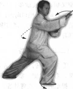②上体左转,左脚尖外展,重心前移; 右拳经体侧下落卷收于腰间,拳心向上, 左拳变掌,向前画弧,掌心翻转向右;头 随体转,目视前方(图159)。