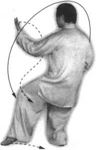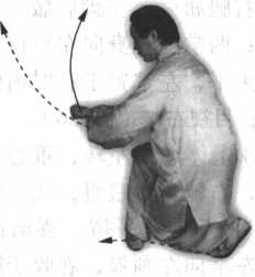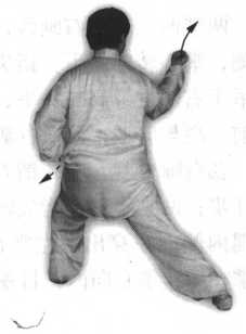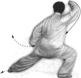 ①上体右转,重心右移;右臂内旋屈 肘上撑,右拳置于右额前,拳心向外,左 臂内旋,左拳向身体左后方穿出,拳心向 后;目视前方(图158)。