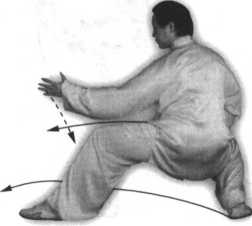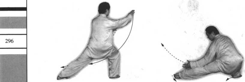 ③右腿全蹲,左腿铺直,上体左转,成 左仆步;两掌绕转,指尖转向左,经腹前顺 左腿内侧向左穿出,左掌在前,掌心向夕卜, 右掌在后,掌心向内;目视左掌(图163)。