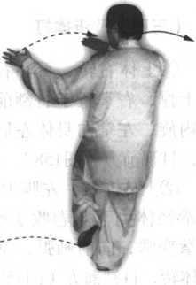 ③右前脚掌为轴,脚跟外展,身体左 转,右腿屈弓,左脚后撤一步,脚尖外展 落地;两掌随转身向左平捋至体前,右掌 高与头平,左掌置于右肘内侧,两掌心斜 相对;目视右掌(图156)。