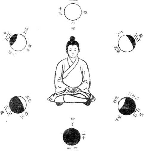 参图丹成九转图,在道家著名的《道藏?云集七笔?中和 集》及《易经》、《玉枢经》、《道书十二种》诸书中.皆用月象比 喻先天八卦三阴三阳与内丹功法等,这些理论都非常注重阴阳二 气的运用。故曰练气功者,观天之道,看四时节气的变化,察月 的盈亏,明阴阳二气的盛衰、幽显,是很重要的。