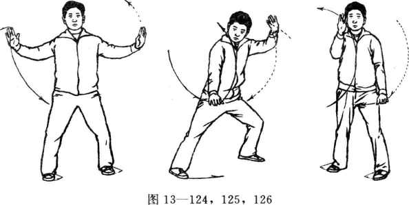 1- 身向左平转,两脚'磨向东北方,呈左斜马步。眼视左掌前 方,两掌如鸟翅先向左盘,继向右旋向东南方,同时两脚随之磨 向东南方,眼仍视左掌前方,呈右斜马步。在左右盘旋的动作中, 两掌随两胯上下相随起伏,并由立掌变为俯掌(见图13-124, 125, 126, 127)。