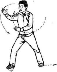 3-身向左转,磨脚呈左弓步,右手掌以食指领气,从裆前顺 缠向上,手掌五指像一把打开的扇子,五指为骨,气为扇面,眼视手 掌,食指、中指、无名指、小指、大拇指依次从鼻尖前划过。立掌时, 掌心向内,划过鼻尖后向外旋,向下落时变俯掌。同时,左掌逆时针 方向从左方下落,反掌变俯掌,同样从裆前由下向上逆缠丝,与右 手掌一样从鼻尖前划过。两掌上下对应。一反一正,身子腰胯、腿 足、手掌一齐转动,左右转动的同时,两足交替向左横行移步。一共 向左横行三个半步,完成三次云手,划三个圆(见图13-128.129,