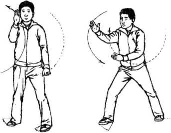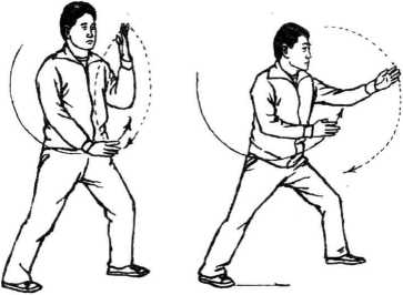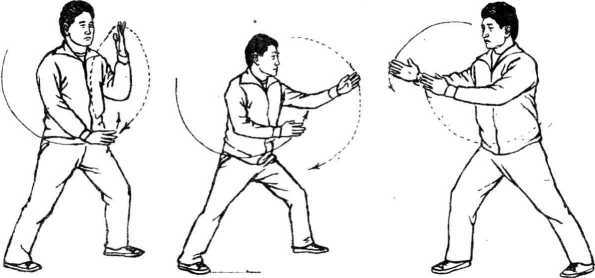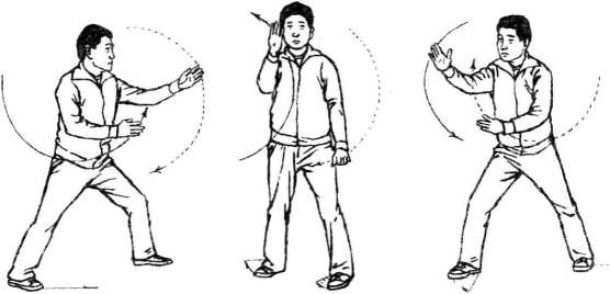 出手划圆圈套圈, 进退开合虚实掌, 不论止面与反面, 左右两腋随意用, 采拗肘靠随机便, 云手横行步法奇, 两把钢刀能削力,