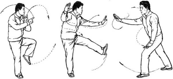 2. 随即将左脚蠢起,用足跟向正南前方蹬出,足尖微向里钩, 两手划弧向前劈出(见图13—150)。