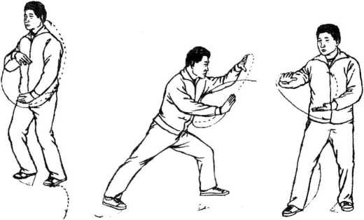 玉女穿梭如织锦, 四面八方都划圆, 两手穿梭上下翻, 变换方位身要活, 左旋右旋门户紧, 动作: