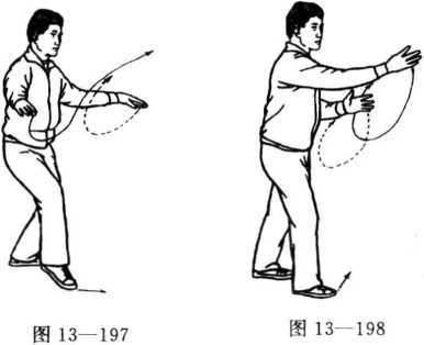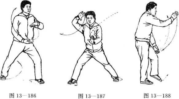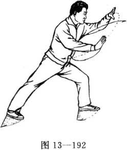变反掌,左掌向前推按。同时磨脚,拧身,呈右弓步,面转向东 北方向,眼从右掌虎口处下视前方,右掌约与头平,左掌与胸平。 此式为“右穿梭”(见图13-187).