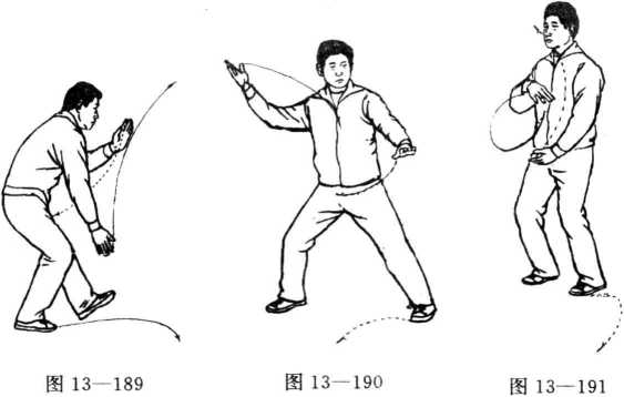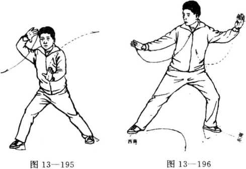 8- 接着又是“左穿梭”,向西北方,再向右转向西南方做“右 穿梭”此式完。图13—191至198