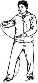 3-身向右转,右掌收回,左拿下落,仍呈横抱球于胸前,面 向正南方。再继续右转至西方时,右脚收回半步,右掌掌沿向前