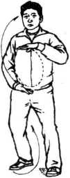 1- 身向右转,身体重心移向右腿,提左脚向东南方向上步,同 时左手上提、屈臂作环抱状,侧掌,掌心向内。置于左胸前,约与左 乳头同高,右手从右上方下落变立掌,右掌心与左掌对正,两臂环 抱,呈右斜马步。眼视左掌大拇指尖,面向南方(见图13—183)。