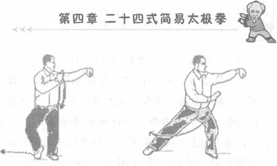 左脚向左前方落步,脚跟着地,脚尖外撇,上体 左转;左手内旋,手心翻转向下;眼看左手(图4-