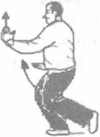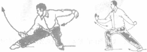 重心移向右腿;右脚尖外撇,右脚屈膝前弓。左 脚尖内扣,左脚自然蹬直,重心恢复至弓步高度;右 手继续前穿并向上挑起;左勾手内旋,背于身后,勾
