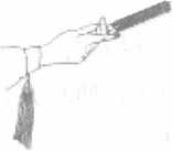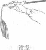 虎口靠近剑格,以食指、拇指和虎口的夹持之劲 ?将剑柄钳住,其余3指自然附于剑柄,这种持剑法比 较灵活,适用于反刺、上云、穿、挂等(图5-2- 6)。