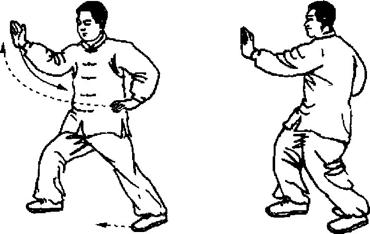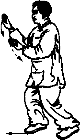 (1)以上桩势不变,向前走动,边走两手边捋化动作,两手 捋化时动作幅度不可过大,两肘轻贴于两肋前;走动时桩势不准