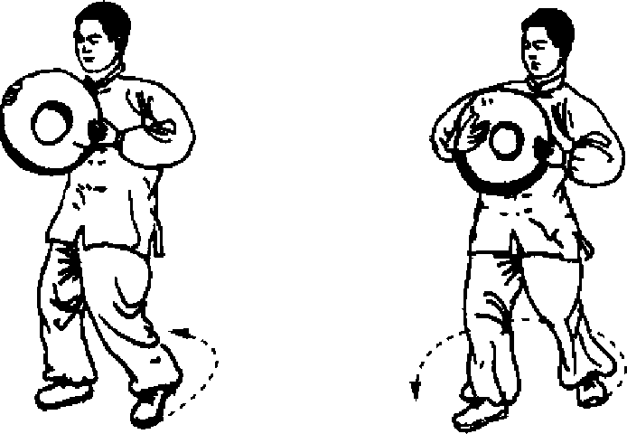 以中班体位站立,双手持重物于胸前,旋转身体,随转体, 两手持重物随之摆动,然后用同样的方法向相反的方向持物旋 转,如此反复练习至不能坚持为止(图3-71、72 )Q