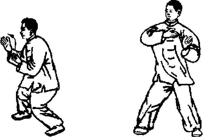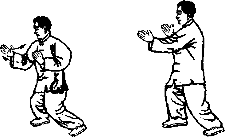 由五行桩势开始(图4-3),右臂成弧形,前臂向下、向右 前上挪架,横于体前,掌心向内,高与肩平,着力点在前臂外 侧,同时左掌随之做向右前上托掌动作,左掌托于前肋前,掌心 向左上方,着力点在左掌;目视左臂方(图4-4)口左搠手方法 与右搠手相同,惟左右相反。