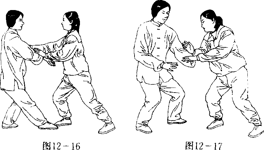 1.甲(着运动服)乙(着民族练功服)推手对抗。甲左手搭 乙右小臂;右手搭乙左小臂。乙两臂棚劲相抗。(图12 —16)