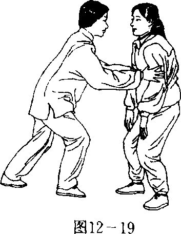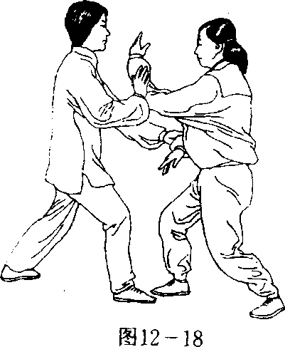 2?乙左手绕到甲右臂外侧,手抚甲右小臂,横劲推甲;同 时,右手与甲脱开。(图12—17)