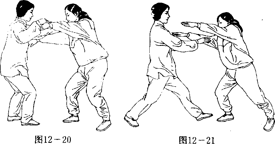 4?甲撤右足,马步桩,两臂下垂,化解乙的攻势。乙乘势, 双手按甲两上臂,俞推。(图12—19)