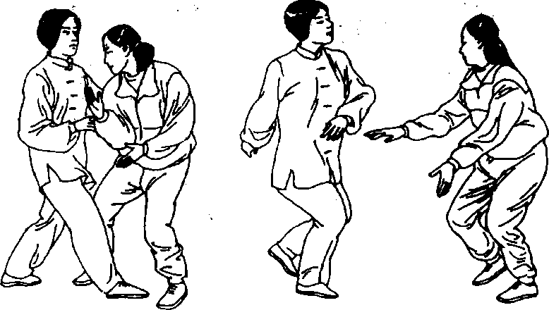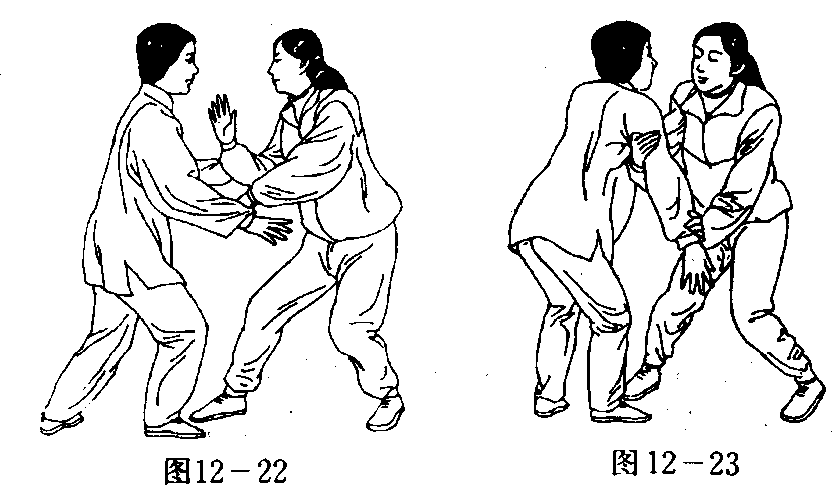 1?甲乙搭手继续对抗。乙左手在甲右臂外侧搭甲右小 臂;甲左手反掌从乙右臂内侧搭乙右腕。(图12—22)2?甲突然右手从乙右臂里侧自腋下伸出,向怀里挎;左 手抚乙右腕,向下向外按。乙全身松开,向下坠,使甲右手挎不 动。(图 12—23)? 308 ?3?甲感觉挎不动,立即撤出右手,改用肩靠,将乙靠出。(图 12—24、25)图 12-24 图 12-25评:这组动作,乙对甲的腋下挎劲采用“千斤坠”的招法对 付,可谓得当。然而,甲打得非常聪明,马上改用*靠,果然奏效。