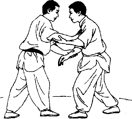 3?姜惊雷撤回右手,屈右臂挤付。同时,右腿从傅能斌左 腿外侧盘入,下绊子。(图13—29)