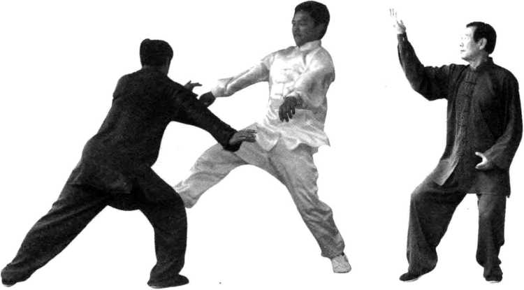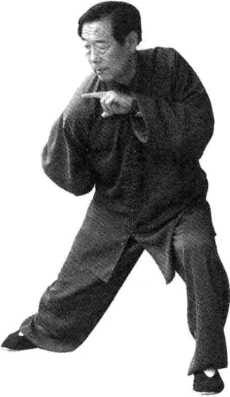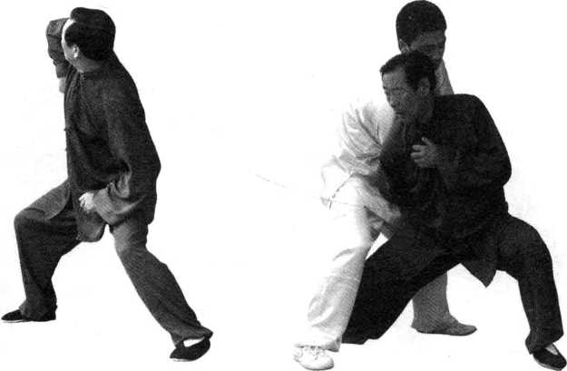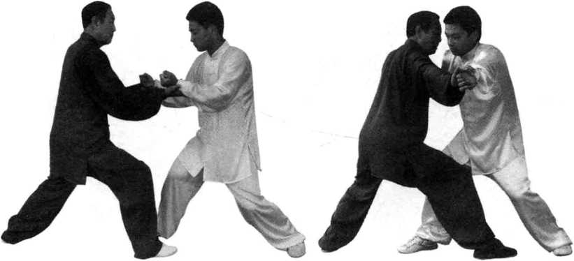 (1)重心左移的同时,左手前上是一瞬间完成的,上右脚、出 右肘与左手前上是相继到位的。然后右肘下探内带与左手顺缠前推, 两臂形成反向运行,有反关节之妙用,望演练者细心体察。