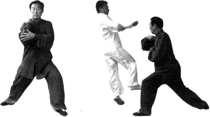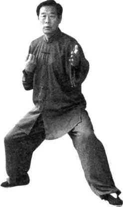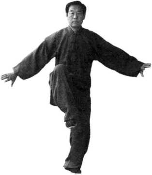 动作一:重心左移,同时提起右脚悬于裆内,继而下落,在右 脚下落的一瞬间,提起左脚向左侧上步。两脚前后更换步法的同时, 右手由前走上弧,然后向下屈肘落于右肋处,同时左手走下弧向前 伸,变竖掌于左侧前,面向南,眼视前方(?3.72)。