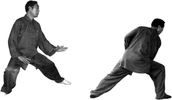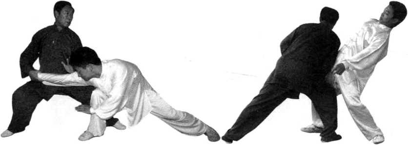 (1)双手向右侧捋与右脚点地,再次右脚前上,突肩发靠劲, 皆是一瞬间连贯完成的,中间无须停留。