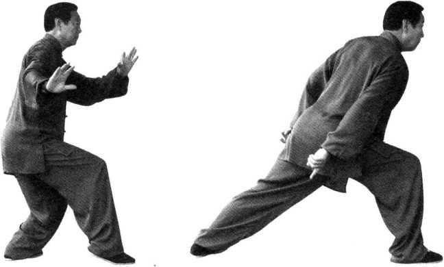 双手划弧身左转,右脚飞快迈上前。