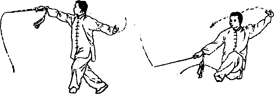 (一)学法身体左转,重心移至左腿,右脚向左脚后插步,脚前掌着地;同 时右手握剑经上向左划弧,变手心朝下,继而两腿屈膝下蹲成歇 步,同时右手握剑向下压剑,臂微屈,腕同膝高;左手剑指向上划 弧,臂呈弧形举于头左后上方,手心斜朝上;目视剑尖(图6-38、 6-39) o(二) 教法提示插步提剑,歇步压剑。(三) 教法感受这是防守性剑法,沉肘、步法、剑法、呼气同时完成。