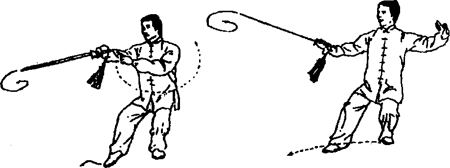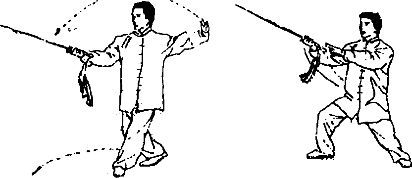 这是进攻性剑法,沉腕时剑走上弧,提腕时剑走下弧。