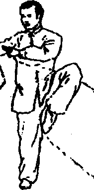 (一)学法左腿屈膝成右独立步,上体略右转;同时右手握剑经上向右前 下方点剑,剑尖与膝同高;左手剑指屈肘右摆,附于右前臂内侧。 手心朝下;目视剑尖方向(图6-72) o(二)教法提示收膝下点。