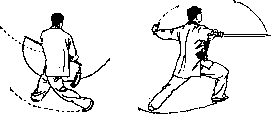 叉步回带剑,弓步反撩剑,歇步崩剑。
