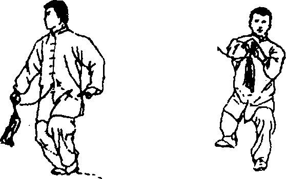 (一)学法身体重心移至右腿,左脚收提至右脚内侧(脚不触地),同时右 手握剑经右向下收至右胯旁,虎口朝前,剑尖朝前,左手剑指经左 向下收至左胯旁,手心朝下,指尖朝前;目视左前下方(图6424)O2.左脚向前上步成左弓步,上体略左转;同时右手握剑立刃向前平刺;左手剑指在胸前与右手相合,附于右腕内侧后向前伸 送,手心斜向下;目视前方(图6-125)。图 6-124 图 6-125(二)教法提示收脚收剑、弓步直刺剑。