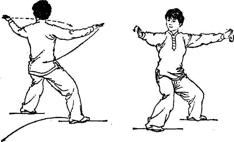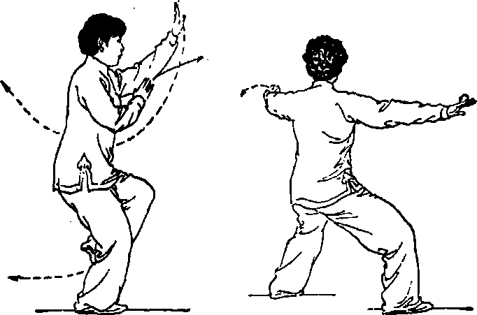 时,右手向前上伸于左肘内侧。接着左脚向左后方落步,左手继续 下落于胸前时,右手经左前臂上向前穿出;尔后身体左转(胸向东 北);两腿屈蹲成右偏马步,左手随体转继续向下、向左、向上划孤 于左前方,腕稍低于肩,指尖朝左前方,掌心向外。右手继续向右 前伸展,腕稍低于肩,指尖朝右前,掌心向外;眼看左手。