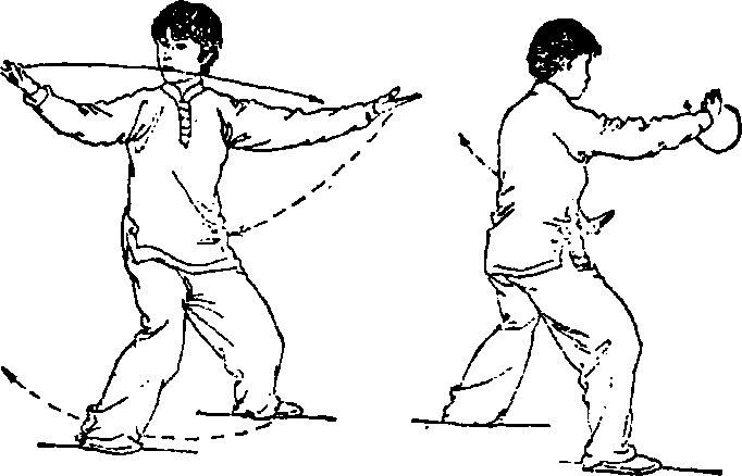 3. 身体微右转;重心稍移向右腿;同时两手外旋掌心翻向上。 随之重心移至右腿并屈膝,左脚掌轻贴地面经右脚内侧向左后方