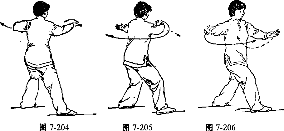1. 身体左转;随着重心移向左腿;同时左手内旋,向左、向上、 向前划弧于左胸前,指尖朝右,掌心向外。右手外旋向下、向左划 弧于右前方,腕稍低于肩,指尖朝右前。掌心向上;眼看左手(图 7-204)0
