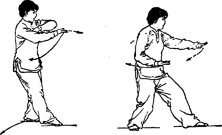 3. 上体左转(胸向东南);重心移向左腿并微屈;随之右脚跟 提起,脚前掌贴地向左后划弧收于左脚右前方,右腿微屈;同时左 手继续向右划弧平摆,屈腕内旋上提于右胸前,手指自然放松下 垂,左臂屈肘横于胸前,肘尖向左前方。右手外旋,向左划弧平摆 于左肘下约10厘米处,指尖朝左前方,掌心向上。接着右脚经左