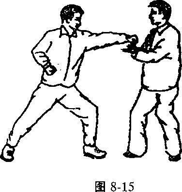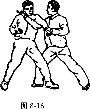 (一)野马分鬃对左弓步冲左拳(甲穿黑鞋)(图8-15.8-16)寰擞法提瀛%甲用左手格抓乙的左腕,迅速上右脚别住乙方左腿,右手穿过 乙左腋下,向颈部、向右后反别,使其倒地。(二)白鹤亮翅对弹踢冲拳(图8-17)图 8-17图 8-17图 8-17图 8-17