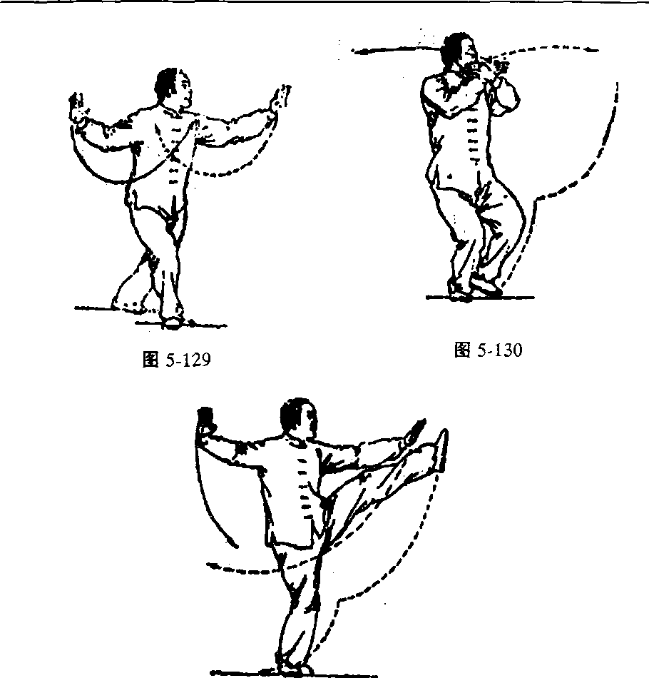 (一)学法1. 重心后移,右脚尖外撇,上体右转;两拳变掌左右分开,掌 心皆向外;目视左掌(图5429)O2. 重心前移,左脚收于右脚内侧,上体微左转;两掌从左右两 侧向下、向内划弧,至腹前相交、举抱于胸前,左掌在外,掌心皆向 内,目视左前方(图5-130) o3. 右腿微屈站稳,左腿屈膝提起,左脚尖向左前上方(与起势 方向成90°)慢慢踢出,脚面展平,高过腰部;两掌向左前和右方划 弧分开,掌心向外,腕与肩平,两臂撑举,肘关节微屈,左臂与左腿 上下相对;目视左掌(图5-131) o图 5-131(二)教法提示撇脚分筝、收脚交叉掌、撑臂提踢。