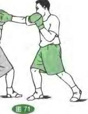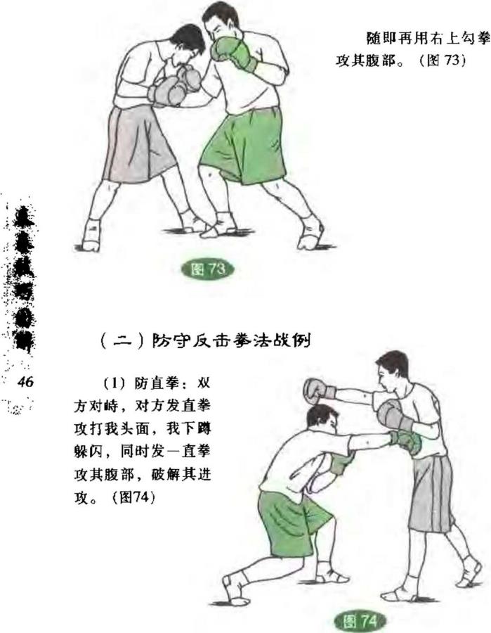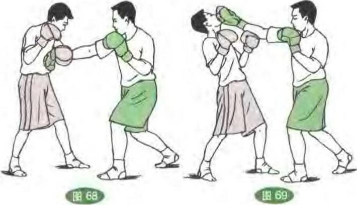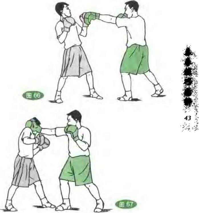 双方对峙我突发左直拳打其面部对方移步后闪。(图66)我随即移步转身用右后摆拳打击其头侧°(图67)44444444(6)右直拳右回手拳——左直拳双方对峙我突发右直拳打其胸部对手用手臂向下挡压。(图68)我随即用右回手拳打其面部。(图69)接着用左直拳攻其胸部。(图70)(7)右后摆拳——左直拳——右上勾拳双方对峙我转身突发右后摆拳攻其头侧对方后闪。(图71)我又用左直拳打其面部。(图72)