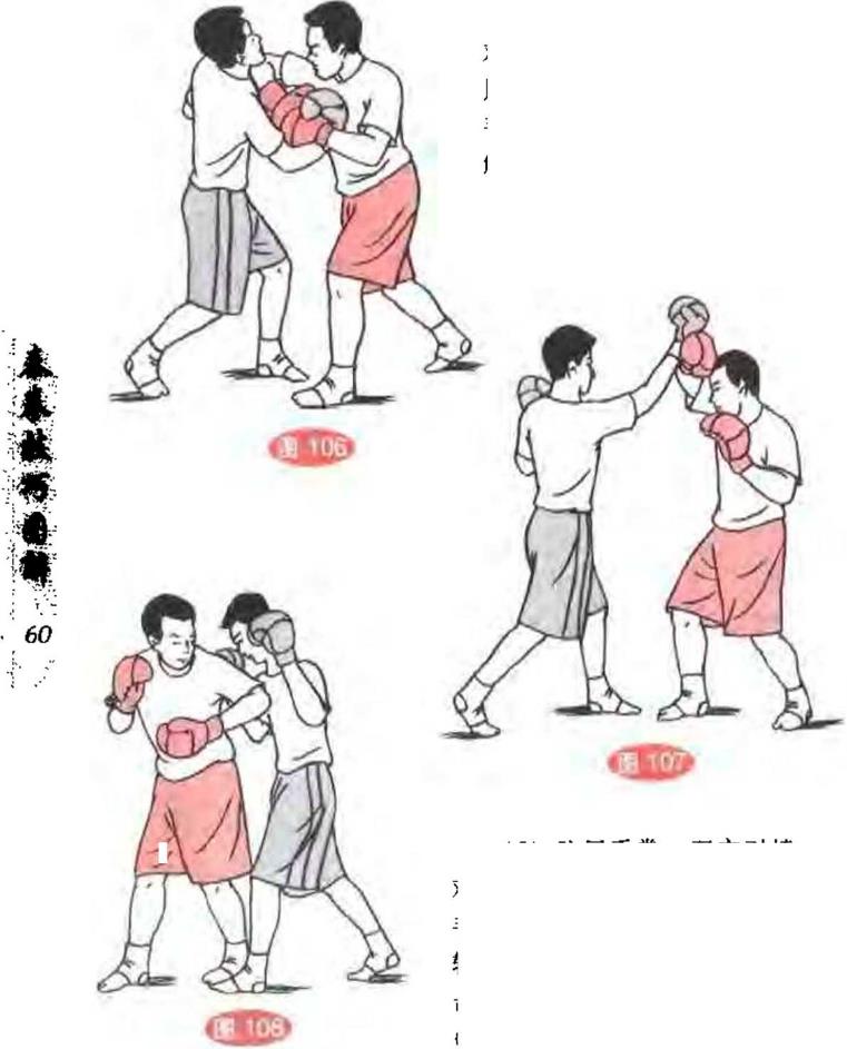 44(4)防勾拳双方对峙,对手用勾拳攻打我下颌处我用一手臂下压其拳同时另一手臂发砸肘砸击对手面胸破解其进攻。(图106)(4)防勾拳双方对峙,对手用勾拳攻打我下颌处我用一手臂下压其拳同时另一手臂发砸肘砸击对手面胸破解其进攻。(图106)