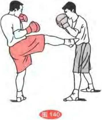 ——右铲踢腿双方对峙,我突发右勾踢腿攻踢对手前腿脚跟。(图138)然后再用右铲踢腿连击其后腿膝部。(图139)(8)右前踢腿——左飞横扫腿双方对峙我突发右前踢腿攻踢其腹部。(图140)接着双腿蹬地身体凌空用左飞横扫腿再攻击其头部°(图141)75757575