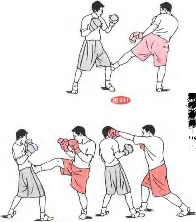 左低侧踢腿——右前蹬腿一在右摆拳双方对峙我先发左低侧踢腿踢击对手前腿胫骨。(图241)接着用右前蹬腿蹬击其腹部。(图242)然后用左右摆拳击打其头两侧重创对手。(图243)九、左低侧踢腿——右前蹬腿一在右摆拳双方对峙我先发左低侧踢腿踢击对手前腿胫骨。(图241)接着用右前蹬腿蹬击其腹部。(图242)然后用左右摆拳击打其头两侧重创对手。(图243)|泰拳技巧图解